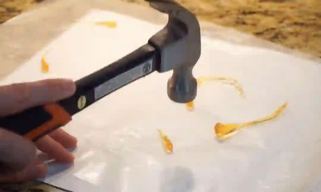 3 现在,可以尝试用榔头锤鲁珀特之泪的圆球部分,看看要多大的力才能把它锤碎。然后用手钳一下鲁珀特之泪的尾巴,看看会发生什么事,是不是一下就碎了?为什么会这样?
