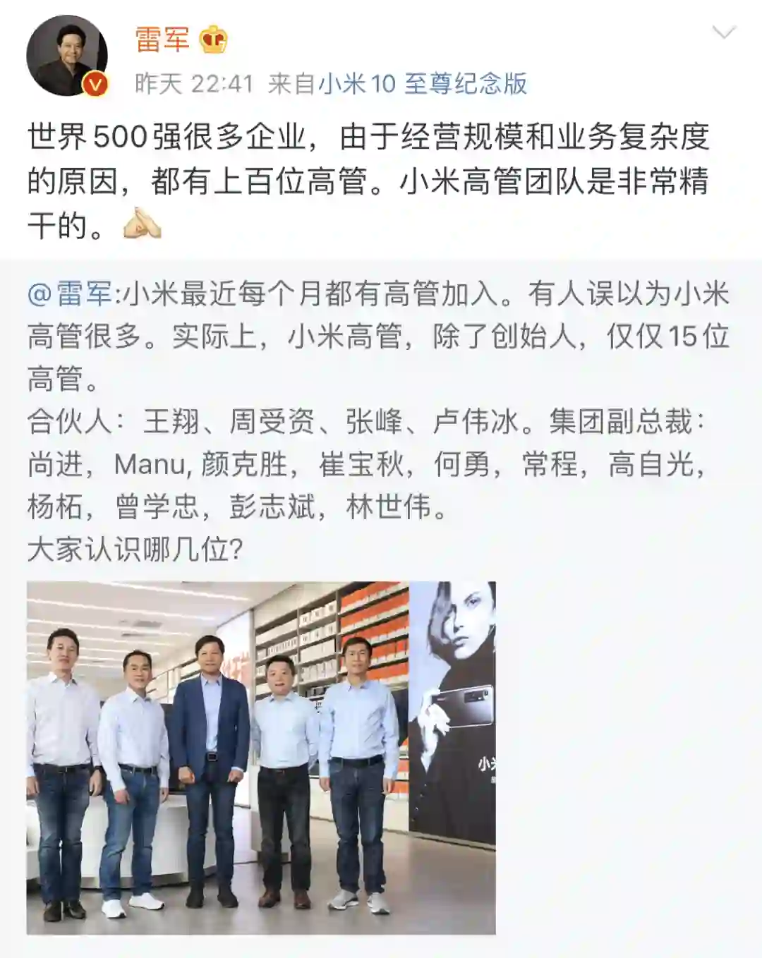 雷军公布小米高管团队:只有15人,常程位列其中