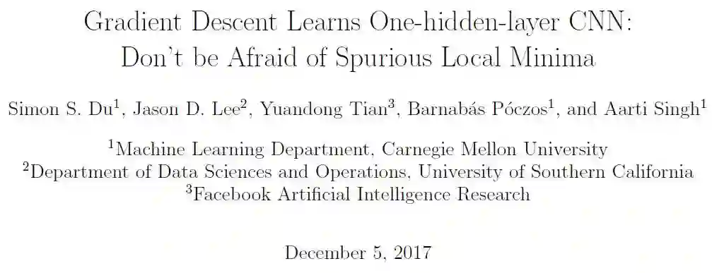 【导读】近日,Facebook FAIR实验室、南加州大学与卡耐基梅隆大学提出《Gradient Descent Learns One-hidden-layer CNN: Don't be Afraid of Spurious Local Minima》 文章证明了在高斯分布的输入和L2损失的条件下(1)对于两层的神经网络,存在虚假的局部极小,但是梯度下降可以以一定概率收敛到全局最优点,给出了单隐层神经网络梯度下降的多项式收敛保证。(2)梯度下降的训练过程分为两个部分,一个缓慢的开始阶段和一个线性速率的收敛过程。以下是相关论文介绍。