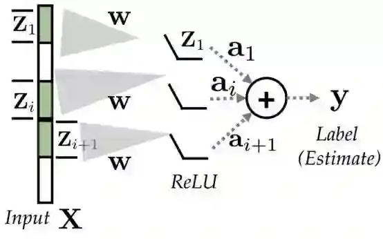 图1(a):拥有未知的非重叠滤波器和未知输出层的CNN,第一个隐层,w作用于输入x中的非重叠的部分,然后再通过一个ReLU激活函数,最终的输出为隐层输出与向量a的内积。