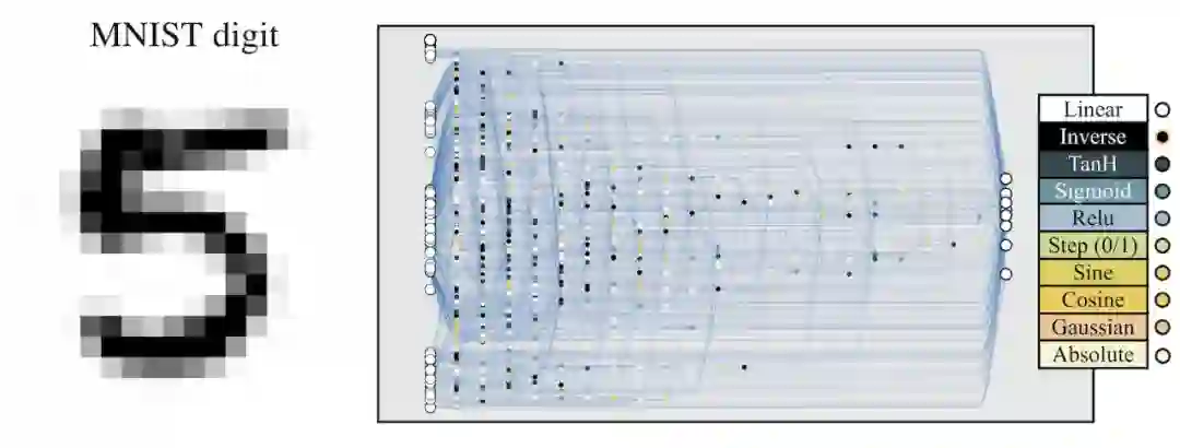 最初的搜索空间包括多个稀疏连接网络、没有隐藏节点的网络,以及输入和输出层之间仅有少量可能连接的网络。使用 insert node、add connection、change activation 这三个算子中的其中一个修改已有网络,从而创建新网络。新节点的激活函数是随机分配的。