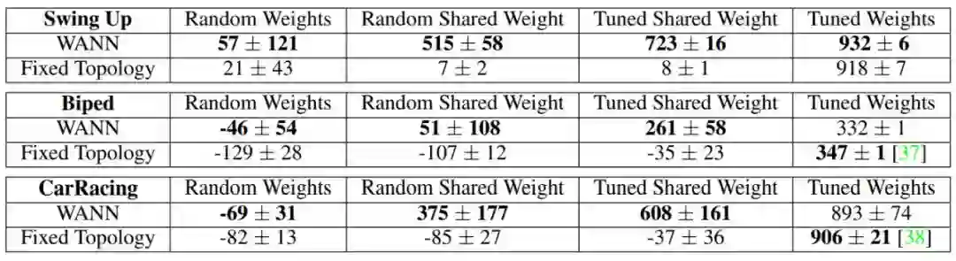 传统的固定拓扑网络仅在大量调参后才能生成有用的行为,而 WANN 使用随机共享权重都可以执行任务。