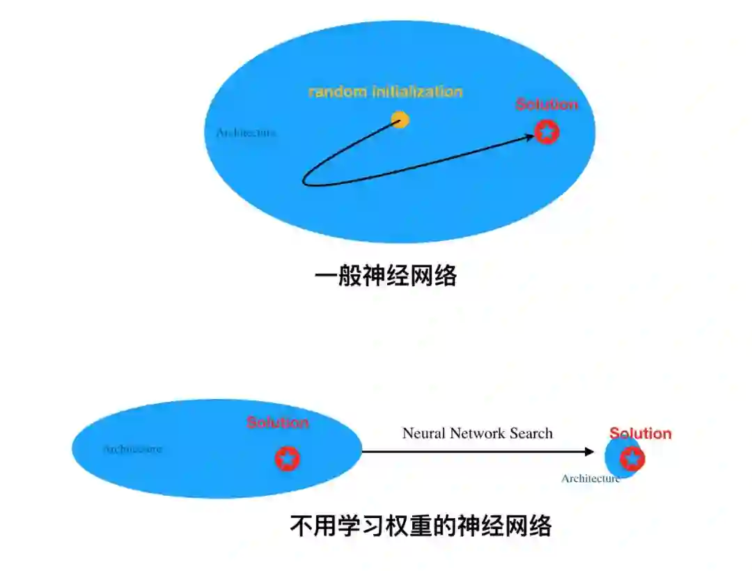 其实在我们的理解中,如果我们想象神经网络架构提供的就是一个圈,那么常规学习权重就是找到一个最优「点」(或最优参数解)。但是对于不用学习权重的神经网络,它就相当于引入了一个非常强的归纳偏置,以至于,整个架构偏置到能直接解决某个问题。