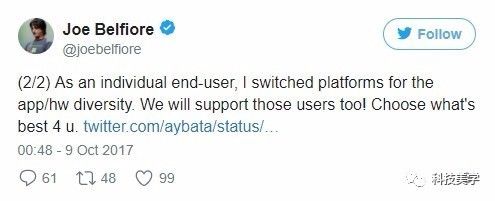 他坦言,作为一个独立终端用户,自已也因为应用和硬件有更多选择改用了其它平台手机(Android)。