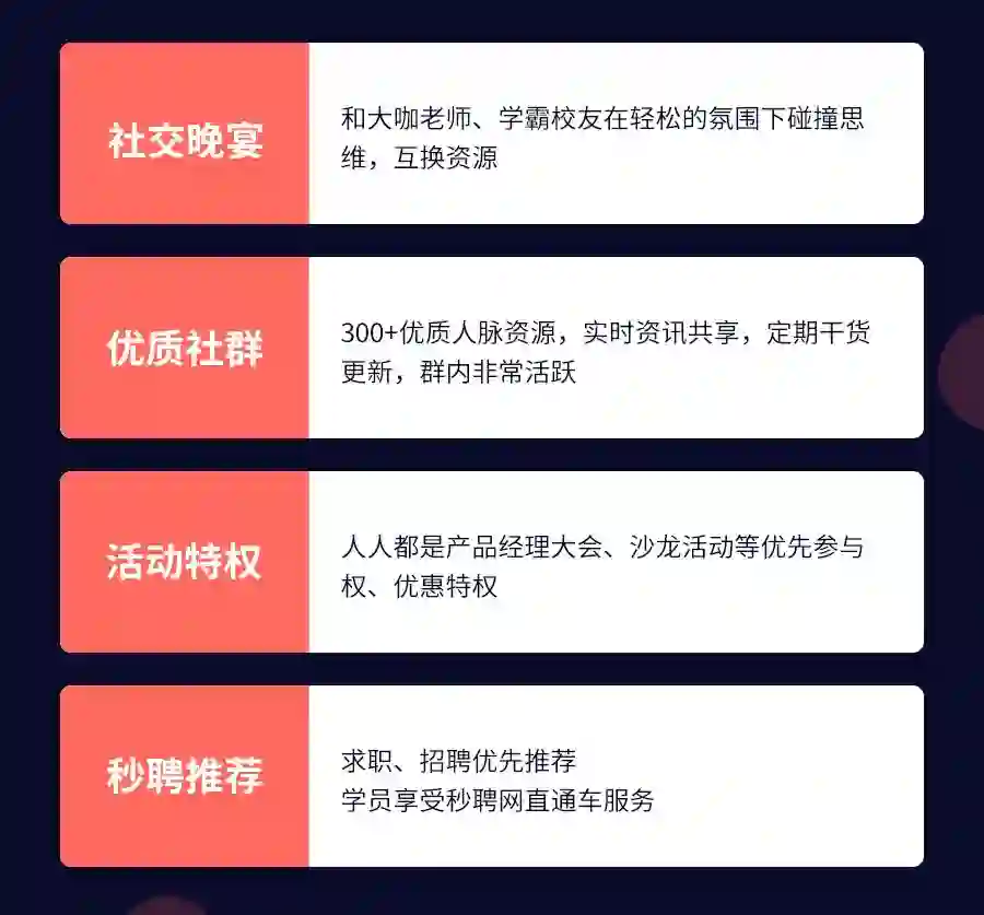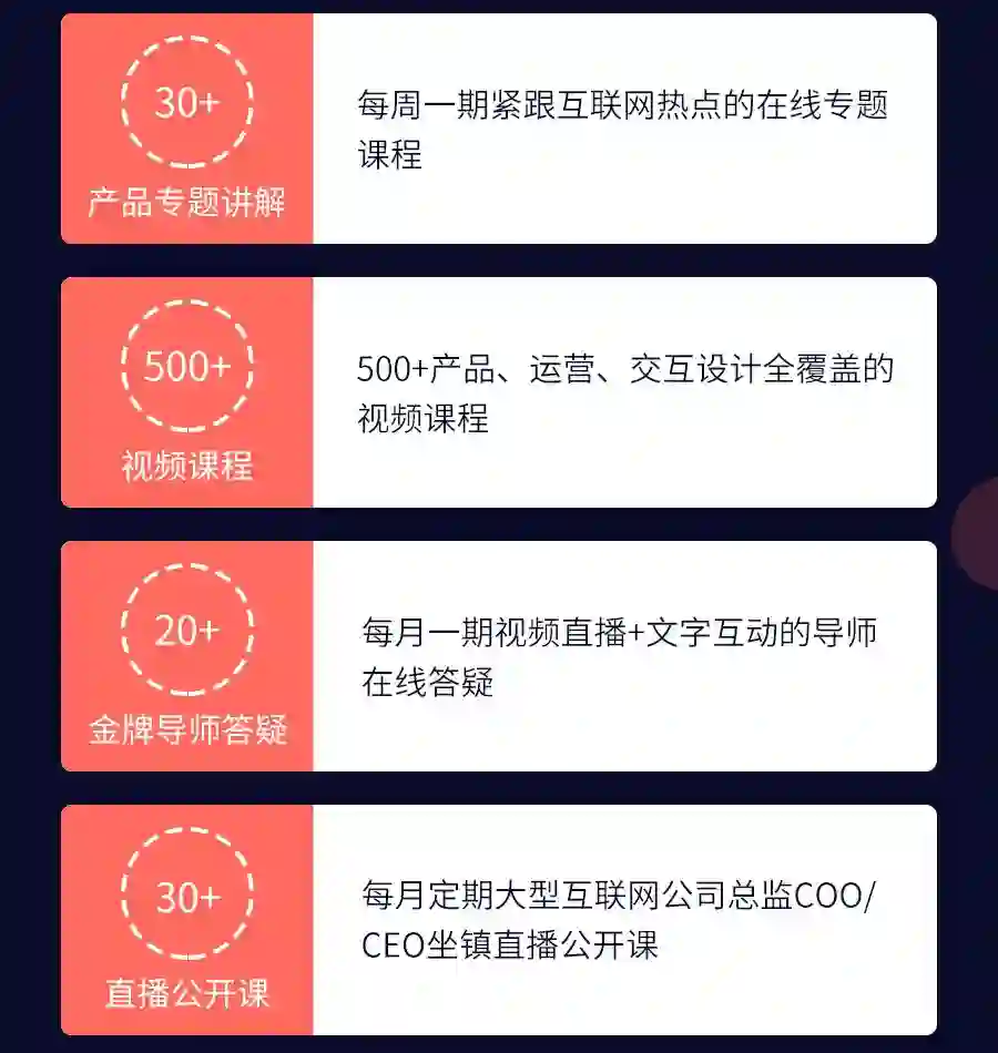 一线导师资源,系统课程内容,丰富的增值服务,系统搭建3年以上产品经理的职场晋升能力模型。