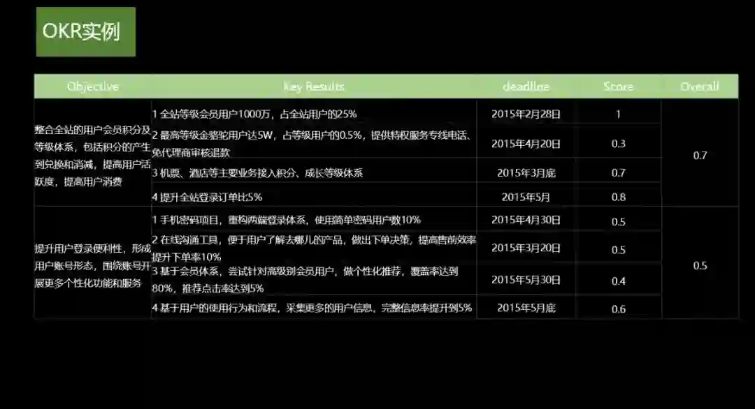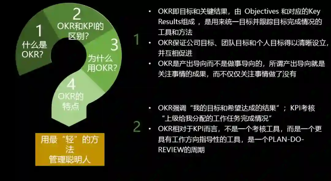 OKR由一个需要极致聚焦的明确目标和量化该目标的数个关键结果这两大主要部分组成。
