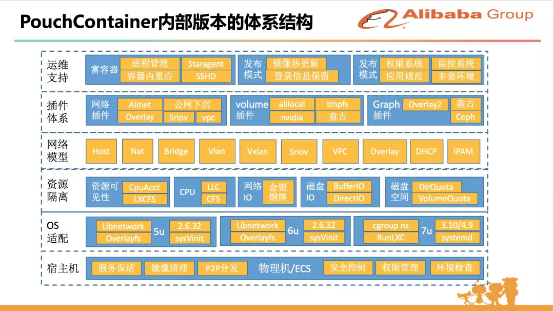 这是 PouchContainer 内部版本的体系结构。在最底层的宿主机层面,我们会做一些管理和运维,目的是为了确保容器运行依赖的基础环境是健康的,包括宿主机的一些镜像清理,包括安全控制、权限管理等。OS 的低版本内核我们是适配到最低 2.6.32 内核,包括容器里面的进程管理也做了很多的适配。资源隔离前面讲过了,网络模型我们内部其实主体用的是 Bridge,但是其他各种各样的场景也都支持。我们开发了很多插件,PouchContainer 开源后,我们才将这些插件逐步做了标准化,兼容适配了社区的 CNI 标准。最上层是一个富容器模式的支持,每个容器里面会启动一些跟内部的运维工具,运维系统息息相关的一些组件,包括一些发布模式的优化。可以看到我们内部体系结构是比较复杂的,尤其依赖内部的其他系统比较多,在外部直接跑是跑不起来的,因此也没法直接开源。