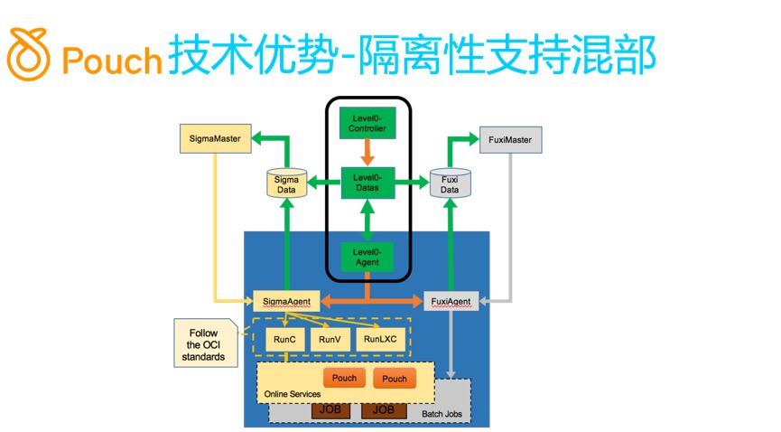 Q:我想问一下 PouchContainer 这个容器跟底层还会去封装 Docker 之类的东西,我第一次接触这个,另外镜像库的话是能够跟 Docker 兼容吗?