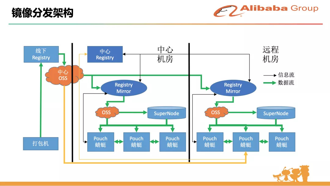 这是 PouchContainer 的镜像分发设计。我们内部有很多比较核心的应用,体量比较大,实例会分布在上万台物理机上。发布新版本的时候上万台机器同时拉镜像,任何中心的镜像仓库都扛不住。因此我们设计了一套镜像分发的二级架构,在每个地域建一个 mirror,在同一个地域内拉镜像的时候用 P2P 分发技术 --- 我们内部的产品名叫蜻蜓,已经开源;需要拉镜像的服务器之间可以分散互相拉文件片段,这样就直接化解了中心镜像仓库的服务压力和网络压力。后面其实还有更好的解决镜像分发的思路,我们正在尝试镜像的远程化,通过存储计算分离技术,用远程盘的方式挂载镜像,直接跳过或者说异步化了镜像分发这一步,目前正在内部环境灰度运行中。