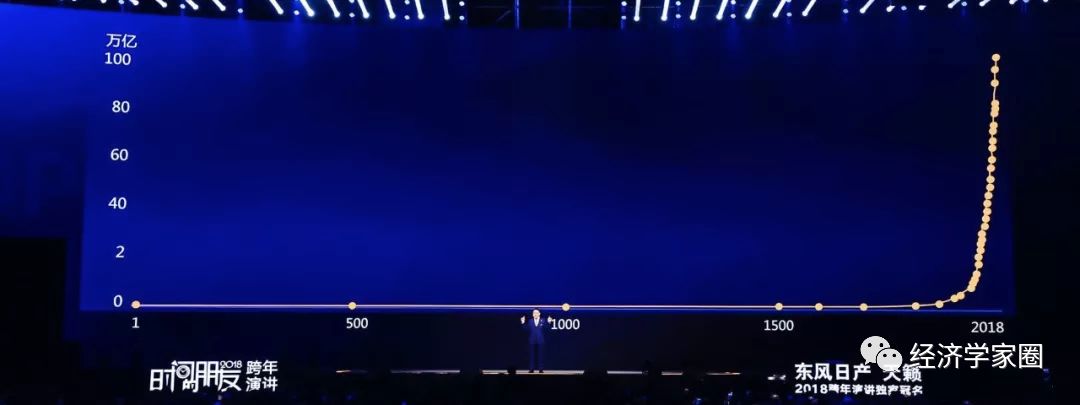 “金融学家香帅给我看了一张图,这是过去两千年人类社会GDP发展的曲线,你看有没有过倒栽葱?你说两千年跨度太大,不说明问题,来,咱们再看过去一百年: