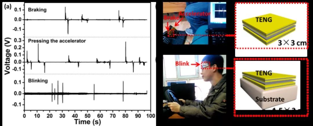 该工作基于Al和Kapton薄膜制备了简易柔性的TENG,通过对其结构性能以及灵敏度做的分析表征,表明TENG可以有效地作为压力传感装置。外部压力作用于TENG导致其形变,产生开路电压信号,其强度和频率对应于外部动作特征,应用于汽车传感领域,并结合多通道数据采集装置,可以监测驾驶员多种行为动作。