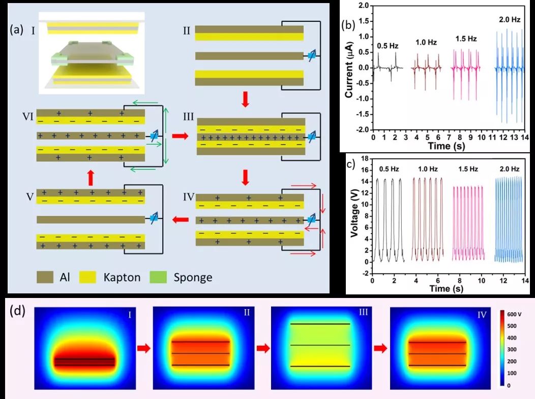 图1. (a) TENG的结构与信号产生机理示意图; (b) 不同测试频率下的短路电流信号; (c) 不同测试频率下的开路电压信号;(d) TENG接触分离过程电势分布的模拟计算。
