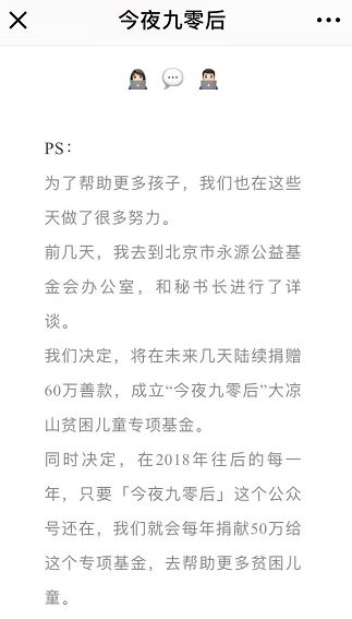 “我们想做更多的是公益,这些都是要花更大的时间和精力的。想切实地做点有意义的事情,对社会有帮助的事情。也希望大家能更关注这块,和我们一起去关心一下大凉山的贫困儿童,包括他们的读书环境、教学楼、三餐等等。我们也联系了很多家企业,之后会进行更大规模物资的捐赠,以及更成熟的公益团队的搭建。”今夜九零后成员说。