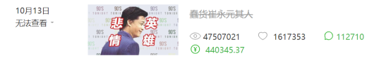其中一篇《蠢货崔永元其人》在被删除之前阅读量达到 4700w,点赞破百万,评论条数破10w,评论点赞破10w,3次触发公众号打赏上限。