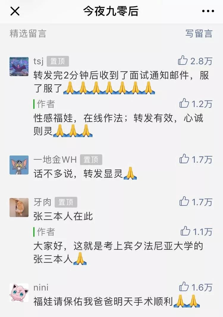 原文评论区成为参拜锦鲤的现场,被作者选择置顶的这条评论表示“自己在转发2分钟后收到了面试通知邮件”。第二条置顶评论“转发显灵”点赞近2万,也从侧面解释了大家纷纷参与“刷屏”的原因。