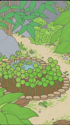 率先映入眼帘的是蛙蛙的庭院,眼前那短树桩圈起的土地里种植着的三叶草便是游戏里的“钱”了。你用它可换置蛙蛙旅行所需的食物和道具。与疯狂“掏空”你腰包的李泽言们不同,三叶草庭院里自己就会生长,连种植步骤都免了。当然,多金玩家左上角氪金按钮走好。