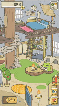 游戏设置的另一重要场景,那便是蛙蛙的家了。上下两层,结构简单。蛙蛙游满归来时,它饿了会在楼下桌前吃饭,吃饱可能做做手工,时而坐立床头读书,或伏案疾书。在家里,更多时候,你只能默默看着蛙蛙做自己的事,或者帮它准备好装有食物、护身符和道具的行囊打包后,等待下段旅程开始。