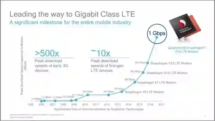 2016年初,美国高通公司发布了全球第一款支持千兆级LTE网络的产品,骁龙X16 LTE调制解调器。骁龙X16 LTE调制解调器率先引入了对免许可频谱资源的支持,可以在授权LTE频段和免许可频段之间无缝切换,在不同场景中自动选择最合适的频段接入运营商的千兆级LTE网络。