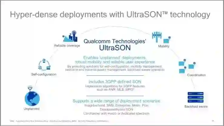 1. UltraSonTM是高通研发的一套自组织和自管理模式。在UltraSonTM的帮助下,运营商可以在住宅区、企业办公场所、体育馆等各种类型的场所中针对性地部署各种类型的小型基站,而这些小型基站能做到即插即用、自主设置并对网络进行自主优化,大大减轻了运营商在大规模部署时的工作压力,提升了小型基站网络的协同性能和稳定性。