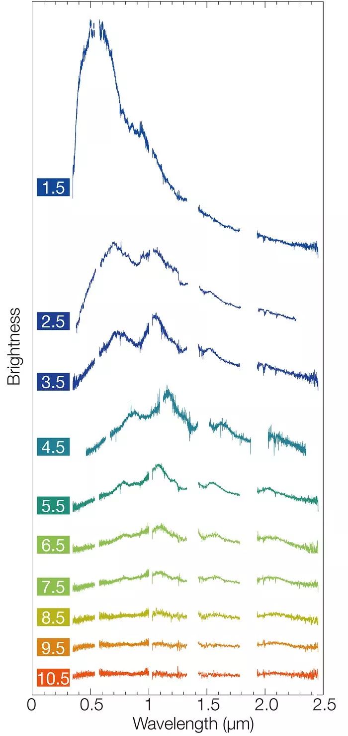 “非常大望远镜”对2017年8月17日发现的双中子星合并的11天跟踪测量的紫外、可见光、红外(从左往右)频段光谱。横坐标是波长,纵坐标是亮度。曲线上的数字标注合并后的天数。