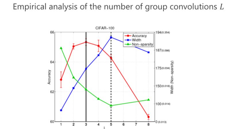 第二个问题,我们究竟要设计多少个组卷积(L 设成多少)?同样我们的准则也是通过参数量最小来进行分析,以前是两个组卷积,我们可以通过 3 个、4 个达到参数量更小,但其实最终的结论发现,并不是参数量最优的情况下性能是最好的。