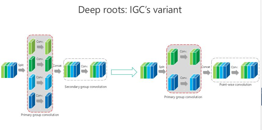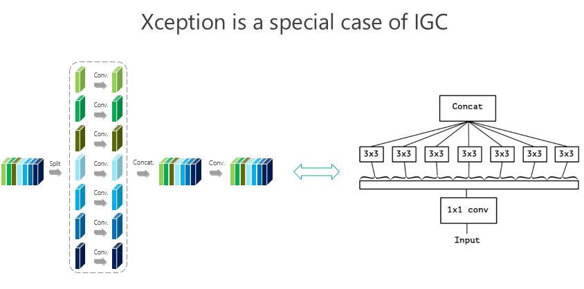我们大概是前年 8、9 月份开始做这个事情,10 月份发现 Google 有一个工作是 Xception,这个是它的结构图,这个形式非常接近(我们的结构),跟我们前面所谓的 IGC 结构非常像,实际上就是我们的一个特例。当时我们觉得这个特例有没有可能结果最好,所以我们做了些验证,整体上我们结构好一点。