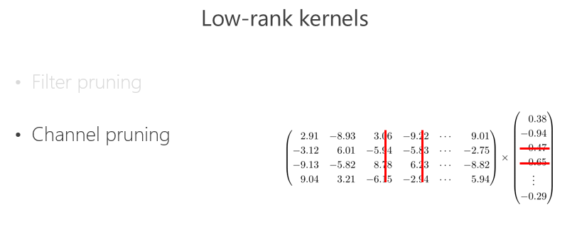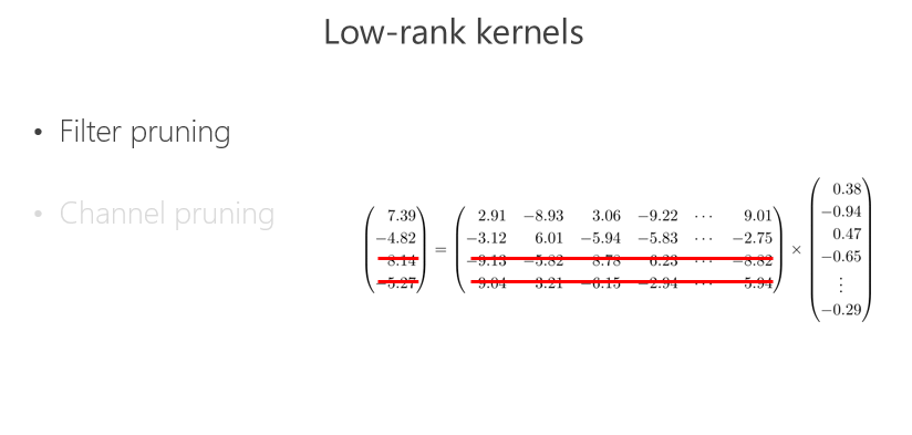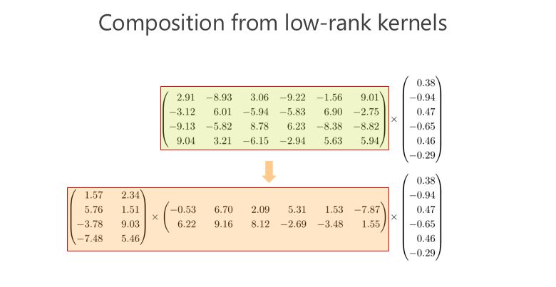 把通道变少会不会降低性能?所以有人做了这件事情:把这个矩阵变成两个小矩阵相乘,假如这个矩阵是 100×100 的,我把它变成 100×10 和10×100 两个矩阵相乘,(相乘得到的矩阵)也变成 100×100 的矩阵,近似原来 100×100 那个矩阵。这样想想,100×100 变成 100×10 跟 10×100,显然模型变小了,变成五分之一。此外计算量也降到五分之一。