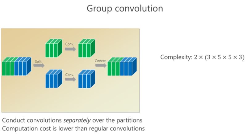 我刚才讲了(一种结构化)稀疏的形式,对应的就是组卷积的形式,组卷积是什么意思?我把这 6 个通道分成上面 3 个通道和下面 3 个通道,分别做卷积,做完以后把它们拼在一起,最后得到的是6个通道。看看计算量,上面是 3×5×5×3,下面也是一样的,整个计算复杂度跟前面的 6×5×5×6 相比就小了一半,但问题是参数利用率可能不够。
