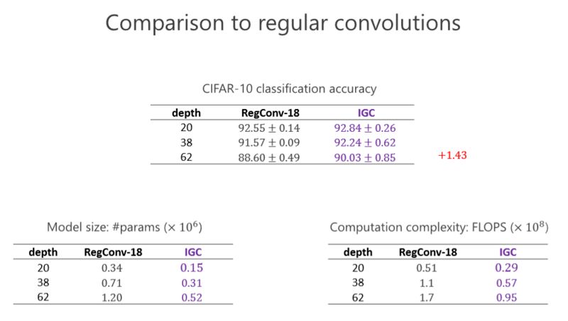 这个实验是跟标准的卷积去比,大家看看左下角的表格,这个表格是参数量,我们设计的网络几乎是标准(卷积)参数量的一半。然后看看右下角这个网络,我们的计算量几乎也是一半。在 CIFAR-10 标准的图像分类数据集里(上面的表格),我们的结果比前面的一种好。我们甚至会发现越深越好,在 20 层有些提升并没有那么明显,但深的时候可以达到 1.43 的提高量。