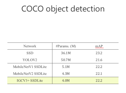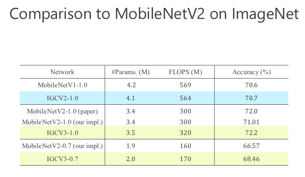 这是两个小的数据集,其实在计算机视觉领域里小数据集上的结果是不能(完全)说明问题的,一定要做非常大的数据集。所以我们当时也做了 ImageNet 数据集,跟 ResNet 比较了一下,参数量少了近五分之二,计算量小了将近一半了,错误率也降低了,这证明通过 IGC 的实现,让模型变宽,在大的网络模型上取得非常不错的效果。