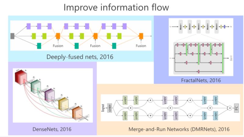 这条路都是通过变深,希望把网络结构训练得非常好,使它的性能非常好,加上 Skip Connection 等等形式来使得信息流非常好。尽管我们通过 Skip Connection 把深度网络训练得很不错,但深度还是带来一些问题,就是并没有把性能发挥得很好,所以有另外一个维度,大家希望变得更宽一点。