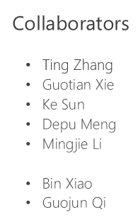 这就是今天的主要内容,这个工作是我跟很多学生和同事一起做的,前面这5个是我的学生,Ting Zhang现在在微软研究院工作,Bin Xiao 是我的同事,Guojun Qi 是美国的教授,我们一起合作了这篇文章。
