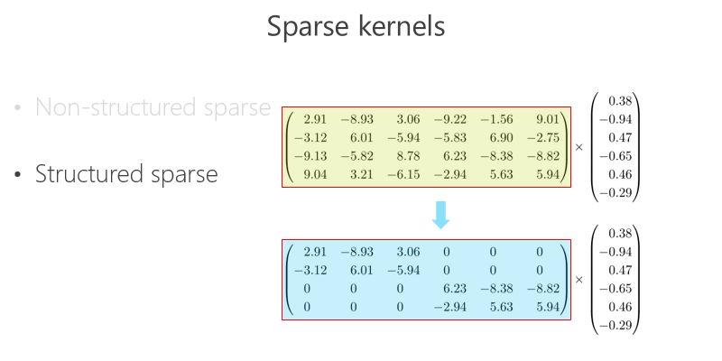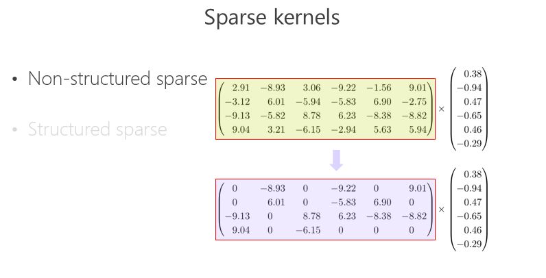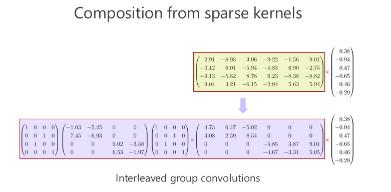 另外一条路,怎么把矩阵跟向量相乘变得快一点、模型的参数少一点?可以把里面的有些数变成 0,比如 2.91 变成 0,3.06 变成 0,变成 0 以后就成了稀疏的矩阵,这个稀疏矩阵存储量会变小,如果你足够稀疏的话,计算量会小,因为直接是 0 就不用乘了。还有一种 Structured sparse(结构化稀疏),比如这种对角形式,矩阵跟向量相乘,可以优化得很好。这里 Structured sparse 对应我后面将要讲的组卷积(Group convolution)。