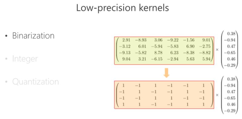 因为卷积核通常是浮点型的数,浮点型的数计算复杂度要大一点,同时它占得空间也会大一点。最简单的一招是什么?假设把卷积核变成二值的,比如 1、-1,我们看看 1、-1转成以后有什么好处?这个向量 1、-1(使得)本来相乘的操作变成加减了,这样一来计算量就减少了很多。除此以外,模型和存储量也减少很多。