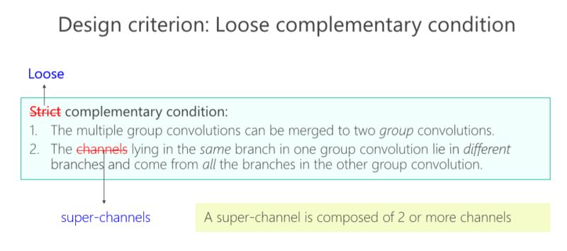 后来我们发现,如果遵循严格互补条件,模型的结构变得非常稀疏、非常宽,结果不见得是最好的。所以我们变成了 Loose。Loose 是什么意思?以前 output(输出通道)和 input (输入通道)之间是有且只有一个 path,我们改得非常简单,能不能多个path?多个 path 就没那么稀疏了,它好处在于每个 output (输出通道)可以多条路径从 input (输入通道)那里拿到信息,所以我们设计了 Loose condition。