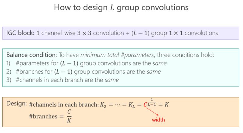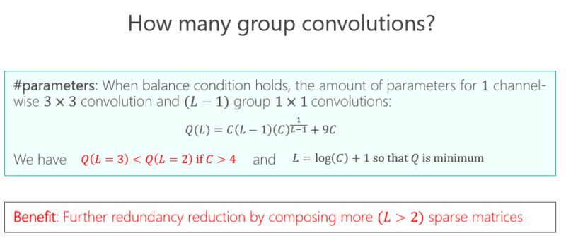 这种方法带来的好处很直接,就是希望参数量尽量小,那怎么才能(使)参数量尽量小?我们引进了所谓的平衡条件。虽然这里面我们有 L-1 个 1×1 的组卷积,但 L-1 个 1×1 的组卷积之间有区别吗?谁重要一点、谁不重要一点?其实我们也不知道。不知道怎么办?就让它一样。一样了以后,我们通过简单的数学推导就会得出上面的数学结果。