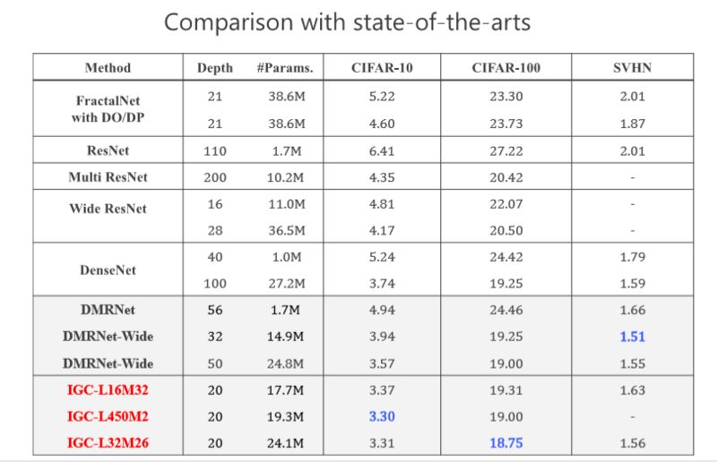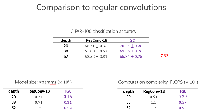 后来 CIFRA-100 我们也做了同样的实验,发现我们提升仍然是一致的,甚至跟前面的比起来提高得更大,因为分 100 类比分 10 类困难一点,说明越困难的任务,我们的优势越明显。这个变宽了以后(性能)的确变好了,通过 IGC 实现,网络结构变宽的确会带来好处。