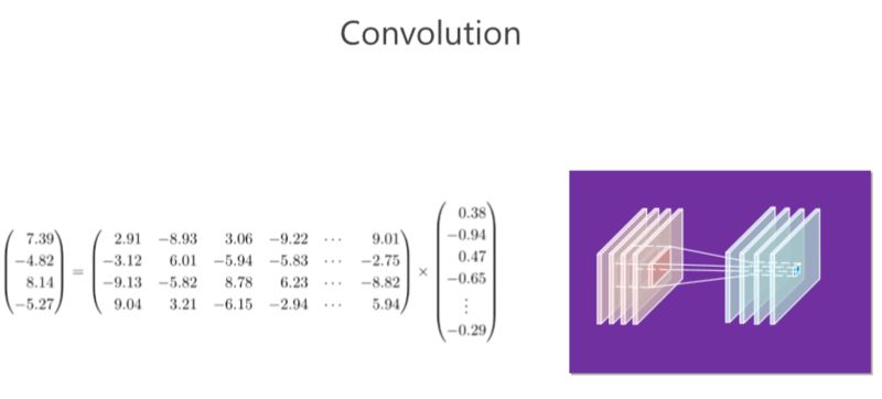 我们回顾一下卷积。右边的图:在 CNN 里面有若干个通道,每个通道实际上是一个二维的数组,每个位置都有一个数值,在这里面我们称为“响应值”。这里面有四个通道,实际上就相当于三维的数组一样。以这里(每个位置)为中心,取一个 3×3 的小块出来,3×34 个通道,那就有 3×3×4 这么多个数值,然后我们把这么多个数值拉成一个 3×3×4=36 维向量。卷积有个卷积核,卷积核对应一个横向量,这个横向量和列向量一相乘,就会得到响应的值,这是第一个卷积核。通过第二个卷积核又会得到第二个值,类似地可以得到第三个第四个值。