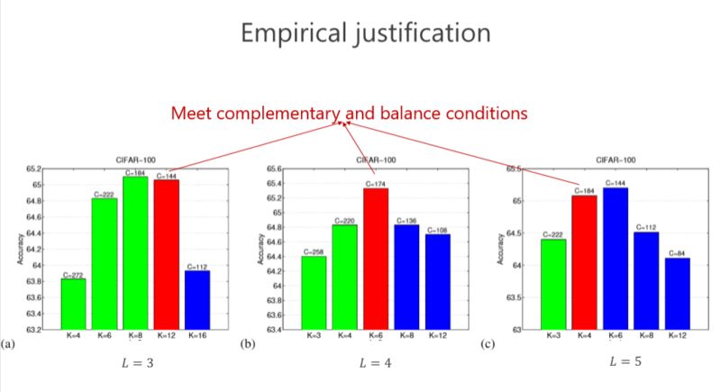 现在再验证一下,前面讲了互补条件、平衡条件,那这个结果是不是最好的?或者是不是有足够的优势?我们做了些实验,这个红色的是对应满足我们条件的,发现这个情况下(L=4)结果是最好的。其实是不是总是最好?不见得,因为实际问题跟理论分析还是有点距离。但我们总体发现基本上红色的不是最好也排在第二,说明这种设计至少给了我们很好的准则来帮助设计网络结构。这个虽然不总是最好的,但和最好的是差不多的。