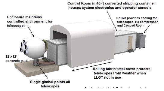 LLGT为LLCD的主要地面终端,这是一个移动型地面接收系统。具有温控外壳,高约4.5m,总质量7t,与目前的无线电通信地面天线相比,尺寸和重量减少约75%。 LLCD 的目标之一是演示验证多孔径合成光信号收发技术。