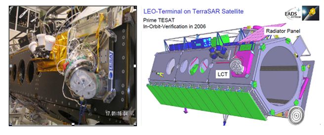 DLR资助的著名项目LCTSX于2002年11月启动,其目的是通过GEO与GEO、GEO与LEO以及GEO与地面站之间的激光链路验证自由空间相干通信的可靠性。用于星间激光通信的两个终端LCTs(Laser CommunicationTerminal),分别于2007年4月23日搭载美国的LEO卫星NFIRE和2007年6月14日搭载德国的LEO卫星TerraSAR-X发射升空。随后,在2008年2月21日成功进行了国际上首次星间相干激光通信实验。