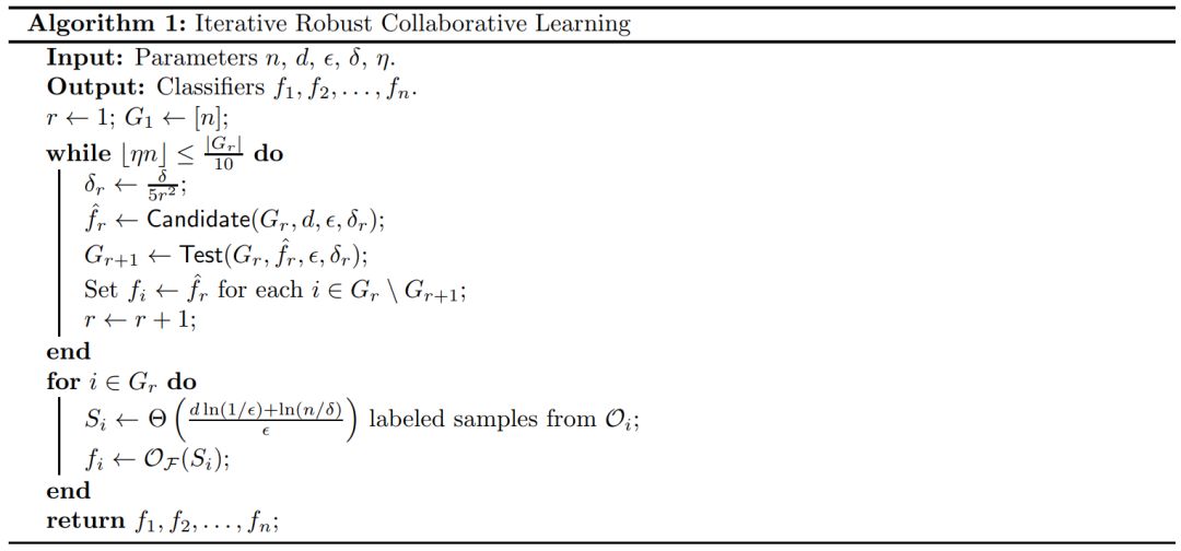 在这部分里,研究者展示了一种迭代(ǫ, δ, η)-学习算法,达到了 O(ηn+ln n)的计算开销(n=O(d))。这里 n表示用户数量,d 表示假设类 F 的 VC-维。由于 F 可以是很大甚至为无穷大的值,作者假设算法通过一个 oracle O_F 访问 F,给定一个标记样本的集合 S={(x_i,y_i)},算法将返回一个分类器 f∈F 从而 f(x_i)=y_i 对所有数据对(x_i , y_i)∈ S 都成立;或者返回⊥,如果 F 不包含任何一致函数。算法通过 n 个样本的数据库 O_1,O_2,...,O_n 和潜在的数据分布 D_1,D_2,...,D_n 进行交互,其中最多有η比例的样本是恶意的。