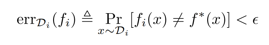 基于这些实际问题,本文提出了一种鲁棒协作学习模型(Robust Collaborative Learning model),并从理论角度研究了在具有不可信协作者的情况下学习的复杂性。在该模型中,一个学习算法与 n 个不同的用户交互,每个用户与一个数据分布 D_i 相关联。如上所述,理想的成功学习算法应当为不同的分布找到个性化分类器 f_1、f_2……f_n,使得以下公式: