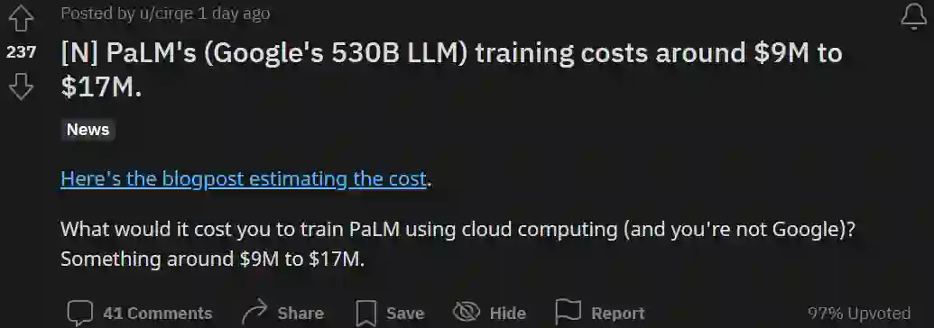 假设我们普通人想用云计算来训练一个 PaLM,我们需要准备多少钱?一位网友算出的结果是:900~1700 万美元。