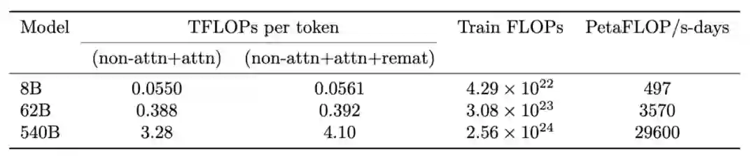 论文还提到,PaLM-540B 在 6144 块 TPU v4 芯片上训练了 1200 小时,在 3072 块 TPU v4 芯片上训练了 336 小时,包括一些停机时间(downtime)和重复步骤。