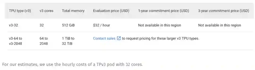 我们可以以每小时 32 美元的价格租用一个 32 核的 TPUv3 pod。约合 1 美元一个 TPUcore-hour。