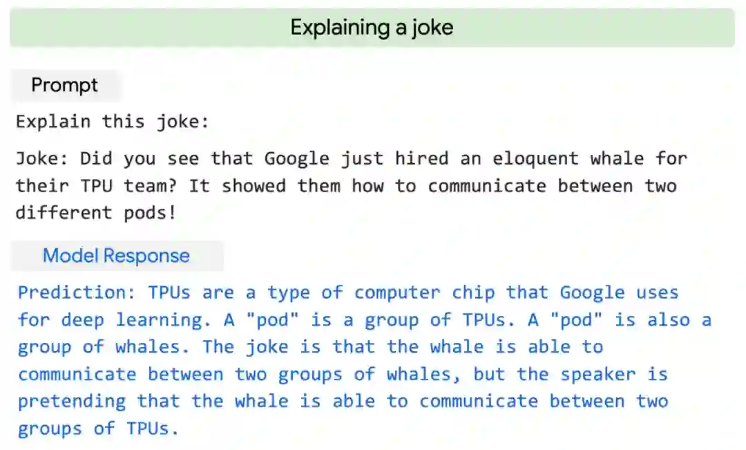 一年之后,Pathways 系统论文终于亮相,Jeff Dean 所在的团队还公布了用它训练的一个大型语言模型——PaLM。实验表明,PaLM 在多语言任务和代码生成方面具有强大的能力,可以出色地完成笑话解读、bug 修复、从表情符号中猜电影等语言、代码任务。