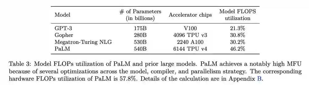 因此,作者假设 PaLM 在 TPU v3 上训练时硬件利用率达到 50%: