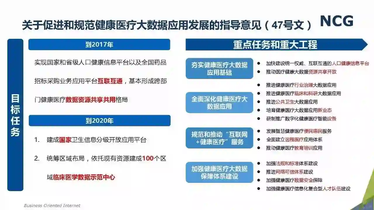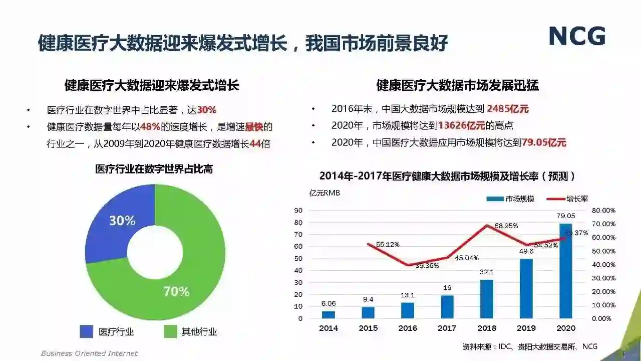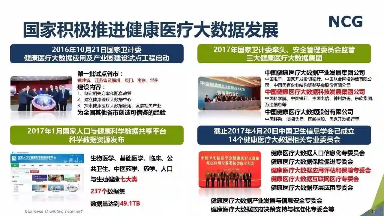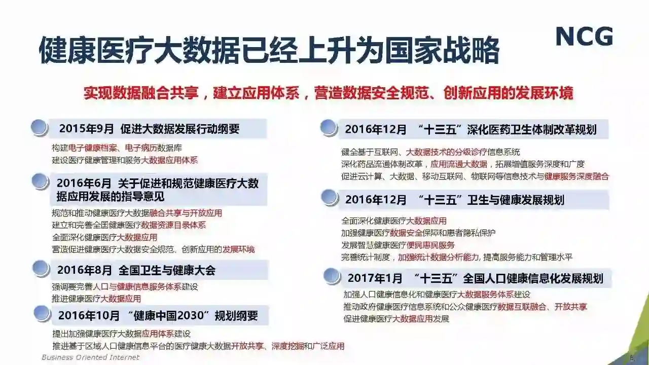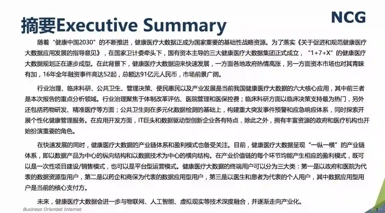 随着“健康中国2030”的不断推进,健康医疗大数据正成为国家重要的基础性战略资源。在国家卫计委牵头下,国有资本主导的三大健康医疗大数据集团正式成立,“1+7+X”的健康医疗大数据规划正在逐步成型。在此背景下,健康医疗大数据迎来快速发展,NCG在此基础上形成了对健康医疗大数据产业分析展望的行业报告。