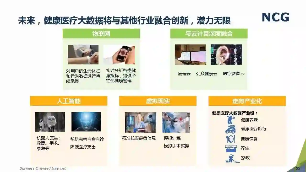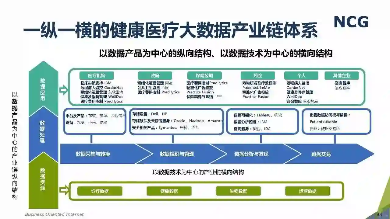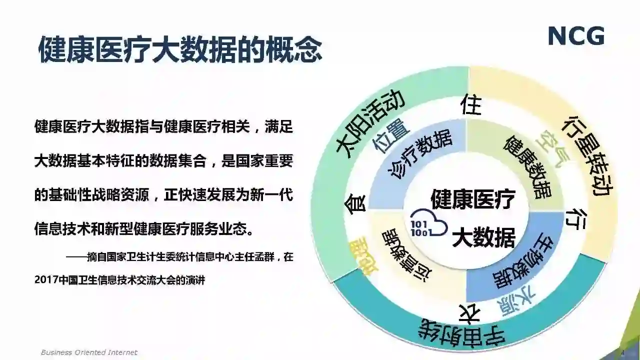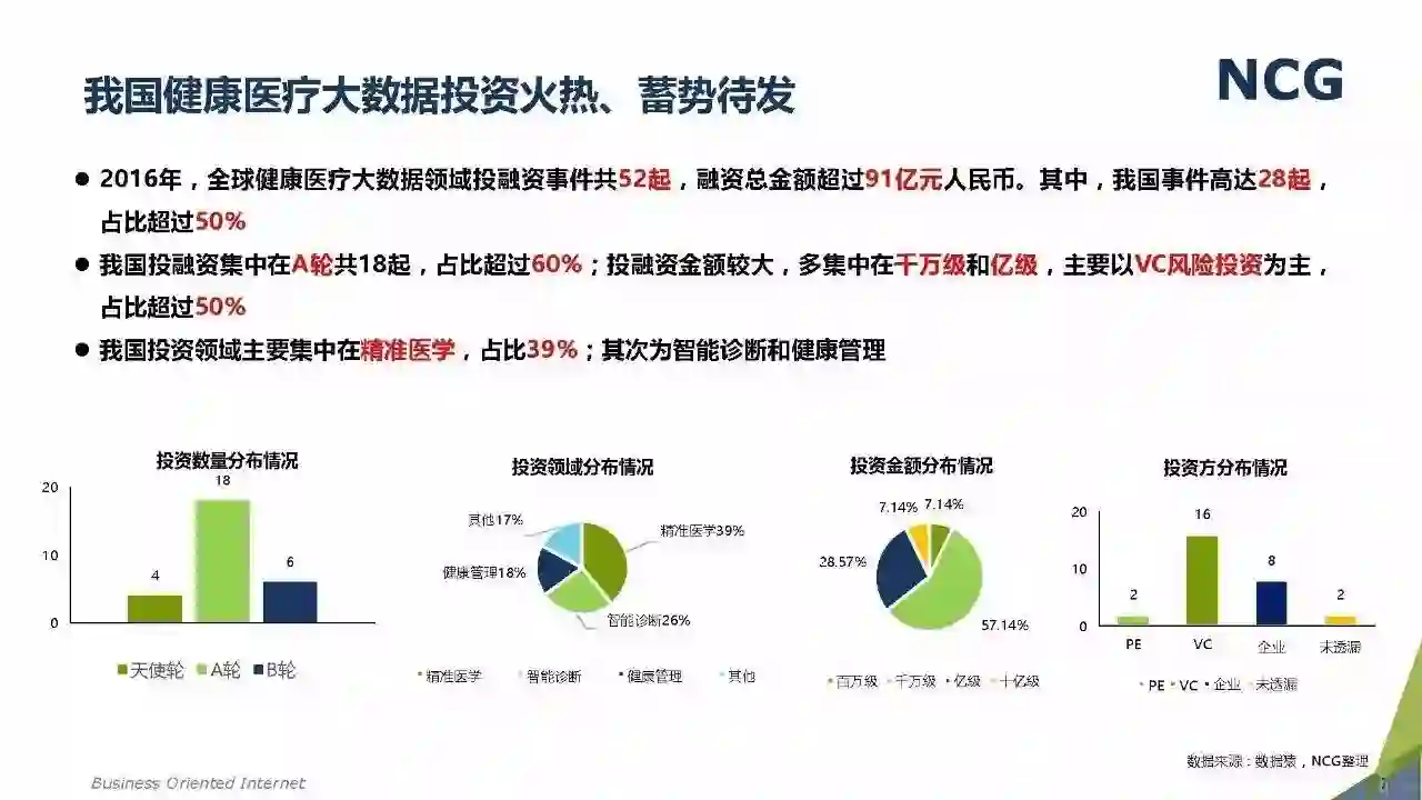 随着“健康中国2030”的不断推进,健康医疗大数据正成为国家重要的基础性战略资源。在国家卫计委牵头下,国有资本主导的三大健康医疗大数据集团正式成立,“1+7+X”的健康医疗大数据规划正在逐步成型。在此背景下,健康医疗大数据迎来快速发展,NCG在此基础上形成了对健康医疗大数据产业分析展望的行业报告。